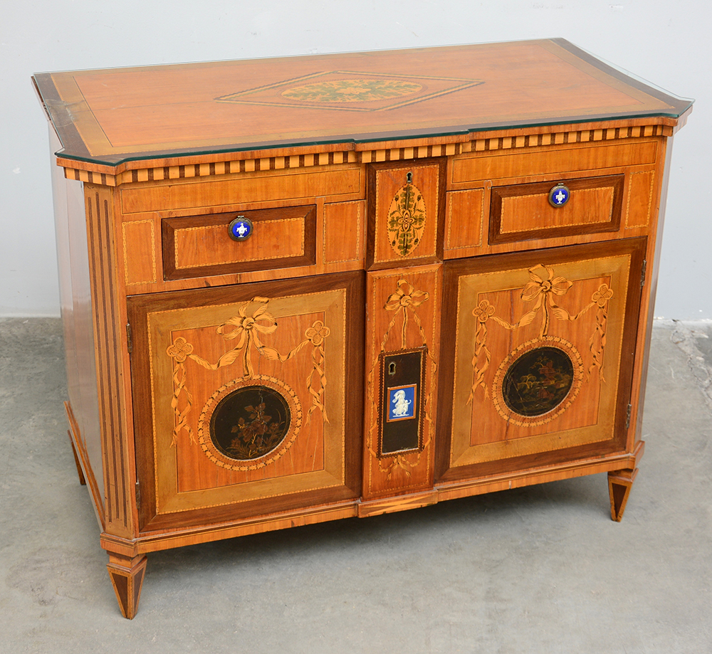 Credenza lastronata in satinwood e filettata in legno chiaro a motivi geometrici a tre cassetti, di cui quello centrale intarsiato a motivi vegetali. Due sportelli intarsiati a medaglioni tondi ebanizzati decorati con paesaggi e fiori e intarsiati con nastro, parte centrale decorata con placchetta wedgwood a motivo neoclassico, piano intarsiato a motivi vegetali entro cornice romboidale e piedi troncopiramidali. Inghilterra prima metà del secolo XIX (cm 118x90x60) (difetti) Si allegata dichiarazione di autenticità di "Antichità Armando Falcieri" in data 9 maggio 1988