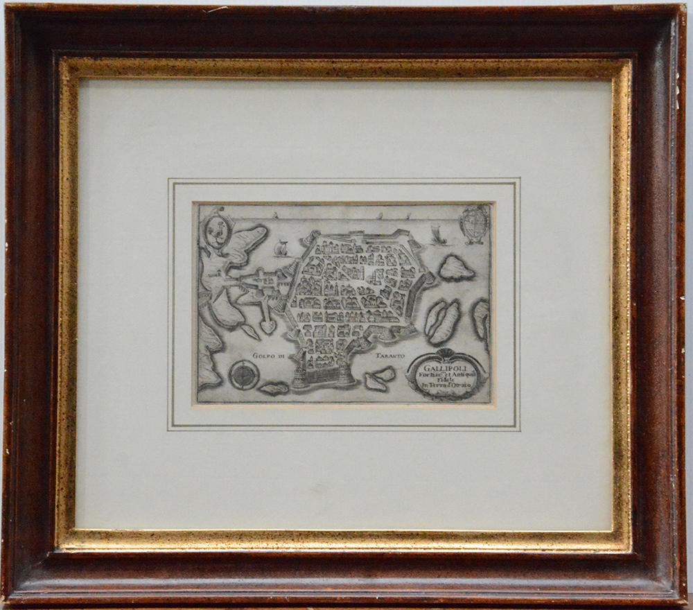 Aquaforte del secolo XVII raffigurante Gallipoli (folio cm 15x19,5) in cornice (difetti)