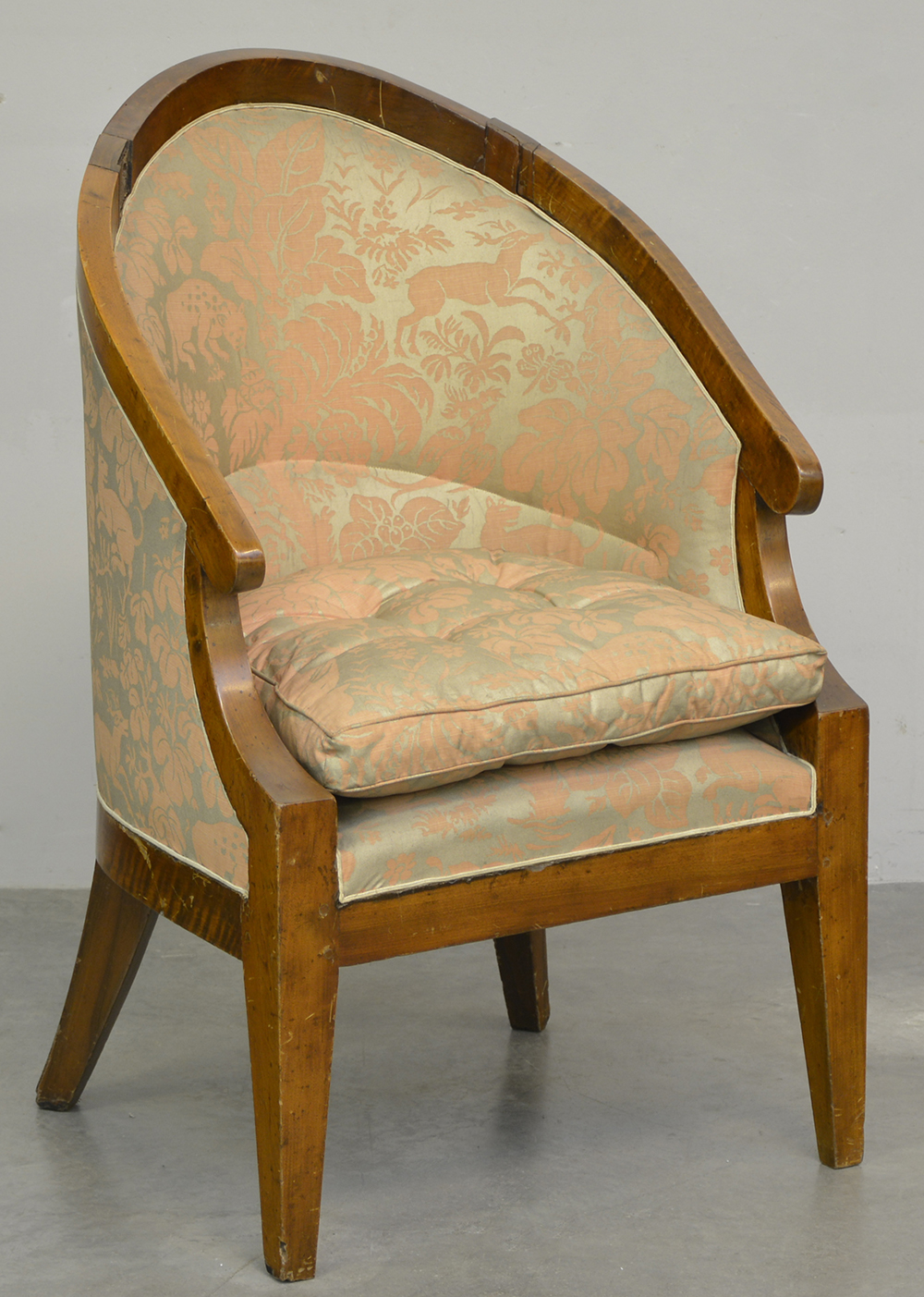 Poltrona di forma mossa in noce e radica con schienale e gambe mosse, seduta e schienale rivestiti in tessuto fortuny. Sec. XIX (difetti e mancanze) -EN Poltrona di forma mossa in noce e radica con schienale e gambe mosse, seduta e schienale rivestiti in tessuto fortuny. Sec. XIX (difetti e mancanze)
