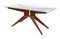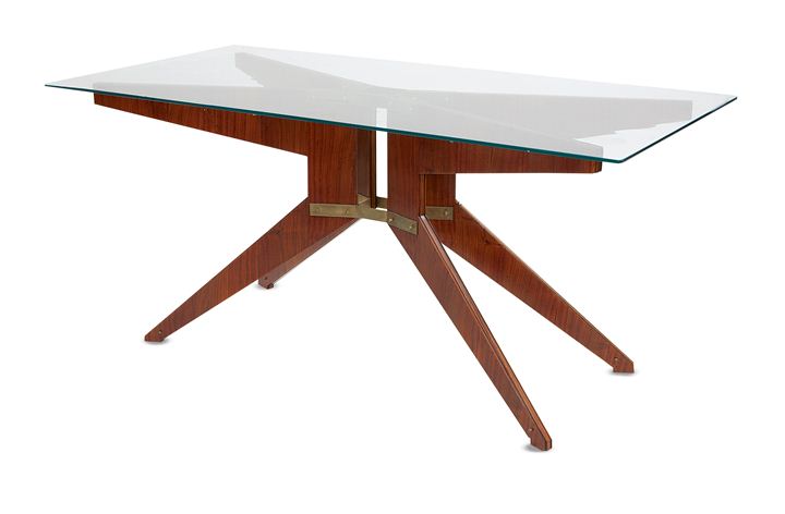 Tavolo con struttura formata da una crociera di quattro elementi in legno uniti mediante supporti e tiranti in ottone. Piano in vetro.