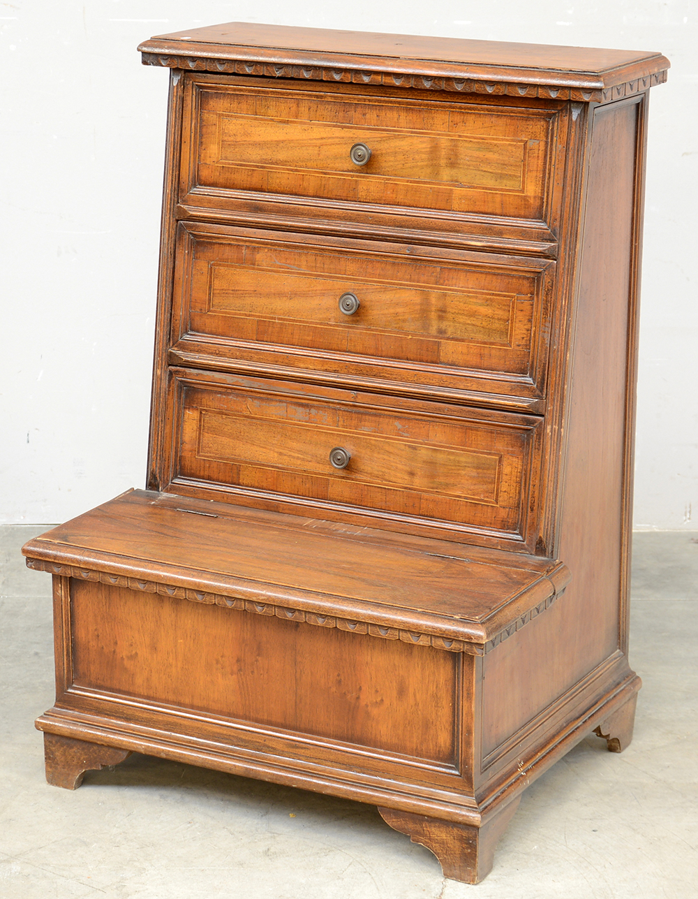 Inginocchiatoio lastronato in noce con tre cassetti filettati, predella...