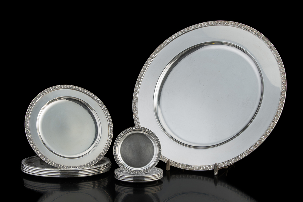 Parte di servizio in argento composto da un vassoio, sei piatti e sei piattini di forma circolare con bordura ad anthemia. Milano, metà secolo XX, argentiere Mainardi Ettore (d. max cm 35 ca.) (g tot. 3100 ca.) (lievi difetti) -EN A silver service part consisting of a tray, six plates and six saucers. Milan, mid 20th century, silversmith Mainardi Ettore (d. max cm 35 ca.) (g total 3100 ca.) (minor defects)