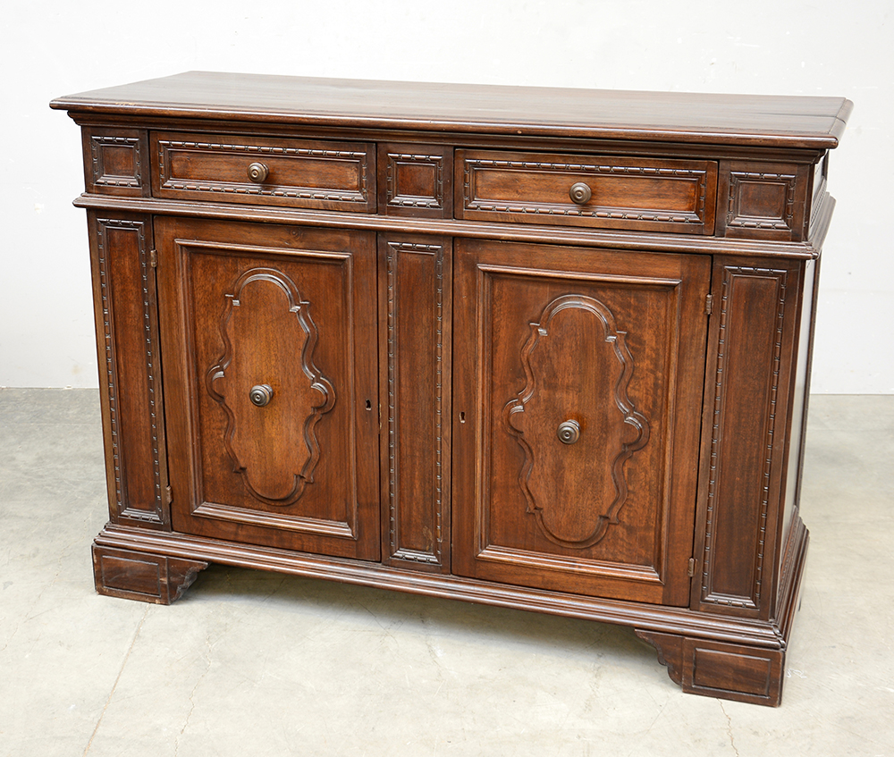 Credenza in legno dolce a tinta scura con due cassetti riquadrati e due sportelli bugnati, piedi a mensola e pomoli in legno (cm 141x102x53) (lievi difetti)