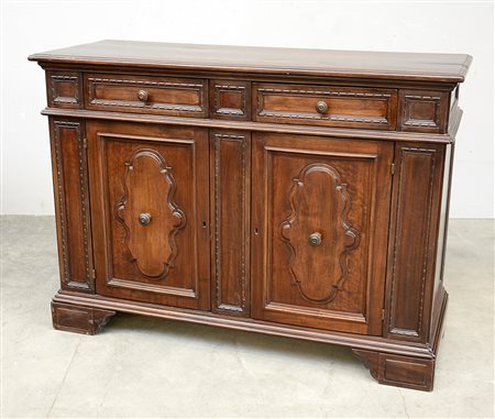 Credenza in legno dolce a tinta scura con due cassetti riquadrati e due...