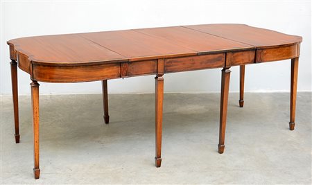 Tavolo allungabile impiallacciato e filettato con fascia sagomata, divisibile in due parti separate e completo di prolunghe, gambe rastremate. Secolo XX (cm 106x72x104 chiuso) (difetti)