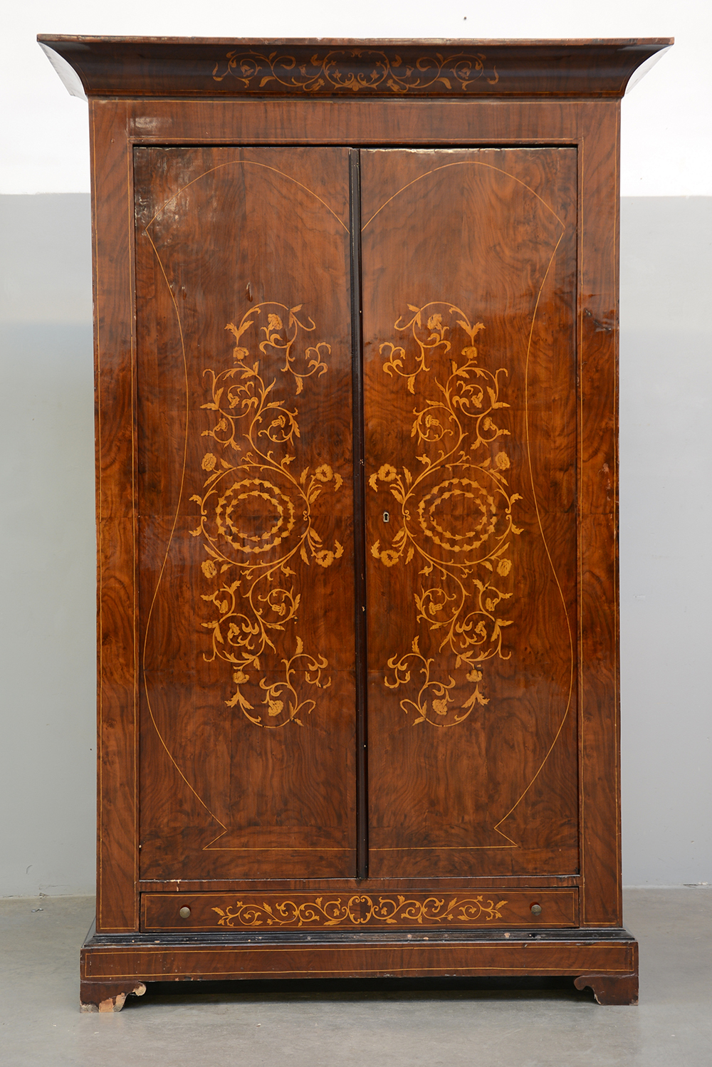Armadio in legno dolce impiallacciato in radica a due battenti e un cassetto, decorato con filettature e intarsi a motivi floreali, piedi a mensola. Primi decenni del secolo XX (cm 145x225x57) (difetti e mancanze)
