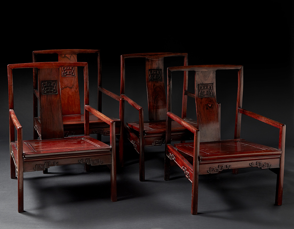 Quattro sedie con braccioli in legno hongmu decorate con motivi geometrici ad intaglio (con certificato) (lievi difetti) Cina, secolo XIX (80x65x54 cm.) -EN Four hongmu chairs, each decorated with geometric motifs, accompanied by a certificate (slight defects) China, 19th century (80x65x54 cm.)