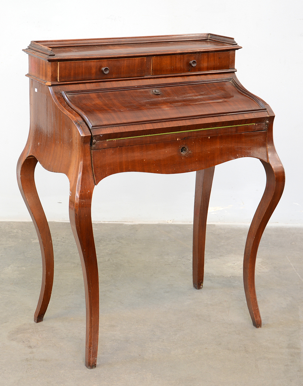 Ribaltina con alzata a due cassetti in linea, antina celante due cassetti e vano, un cassetto nella fascia mossa e gambe sagomate (cm 72x97x47) (difetti)