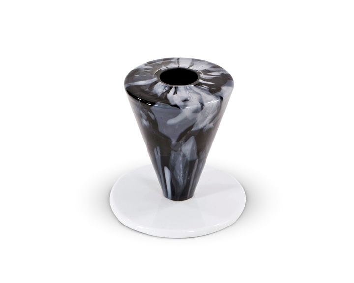 Vaso in vetro trasparente con striature opaline bianche incamiciato nero. Base in vetro bianco.