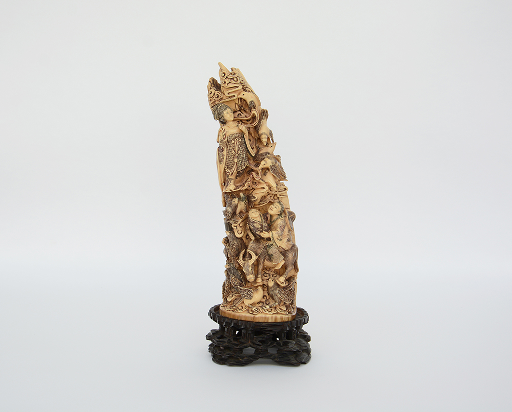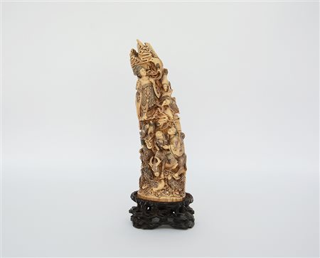 Scultura in avorio fossile raffigurante dama fanciulli e animali con base in legno(difetti) Cina, sec. XX (h. 41 cm.) -EN .