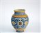 Vaso globulare in maiolica policroma, decoro continuo a geometrizzazioni blu, giallo e verde (h. cm 27) (difetti e restauri)