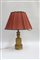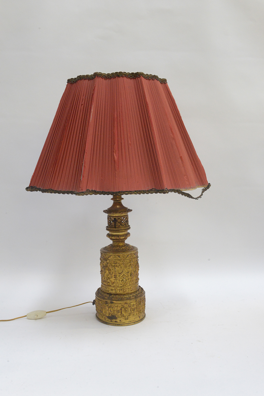 Lampada da tavolo ad una luce con struttura in metallo dorato e sbalzato, completa da paralume in stoffa (h tot cm 61) (difetti)