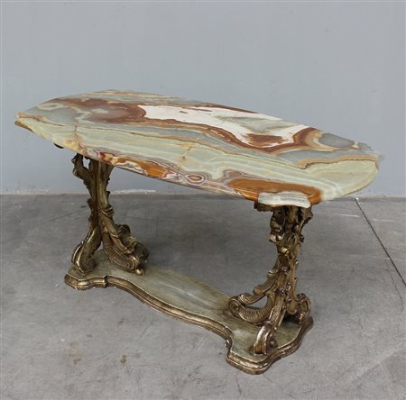 Tavolino da salotto di forma sagomata con gambe intagliate e laccate. Piano in onice (cm 107x53x57)(difetti)