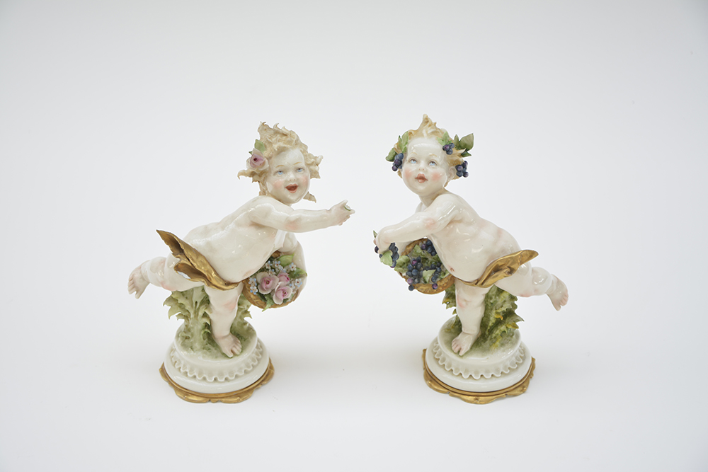 Manifattura italiana, coppia di amorini con canestre di fiori ed uva in porcellana policroma (h cm 14) (difetti e mancanze)