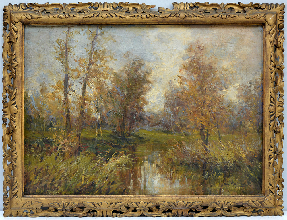 Anacleto Moiraghi (Binasco 1880 - Milano 1943) "Autunno" olio su tela (cm 65x91) Firmato in basso a destra. Al retro: titolato e firmato. In cornice (difetti)