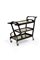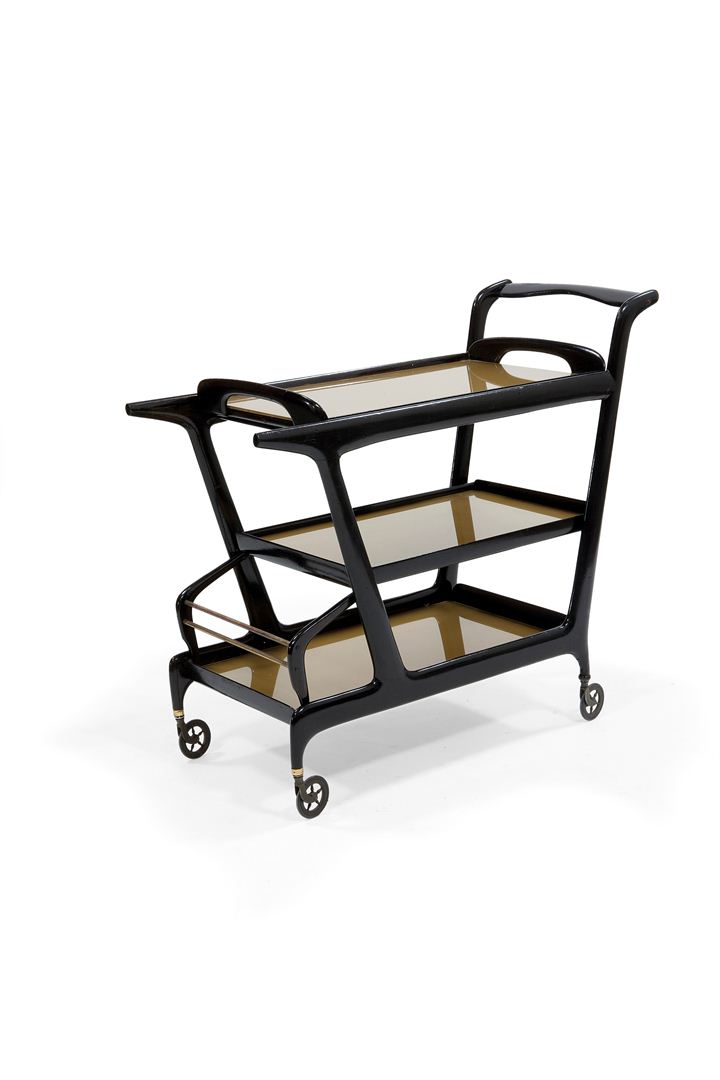 Carrello portavivande a tre piani in legno ebanizzato. Vassoio asportabile, piani in vetro verniciato oro.