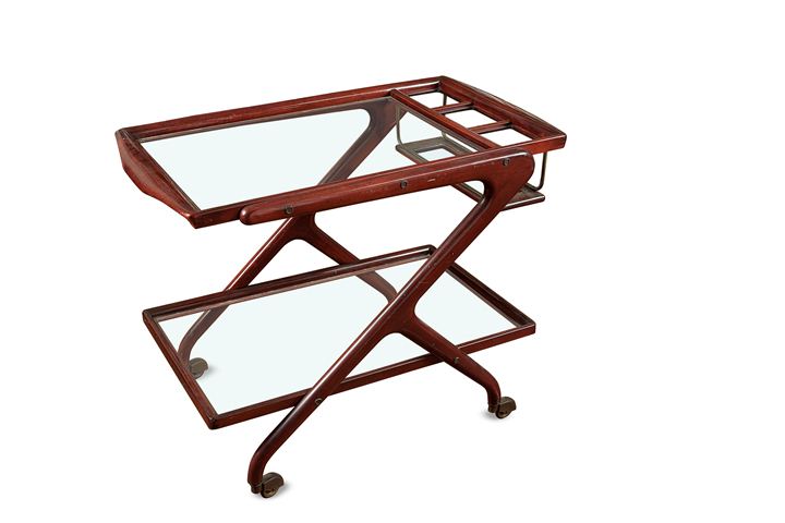 CARRELLO Carrello in legno di mogano, piani in cristallo, ruote in ottone...