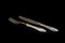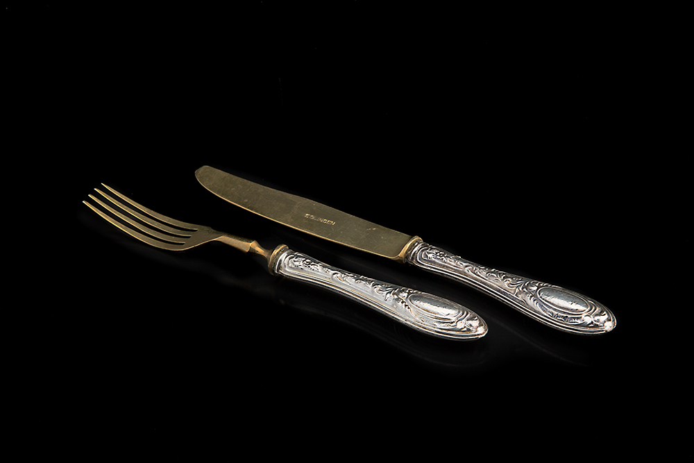 Servizio da dolce composto da dodici forchette e undici coltelli con manico in lamina d'argento decorato a motivi floreali e aderenze in metallo (difetti)