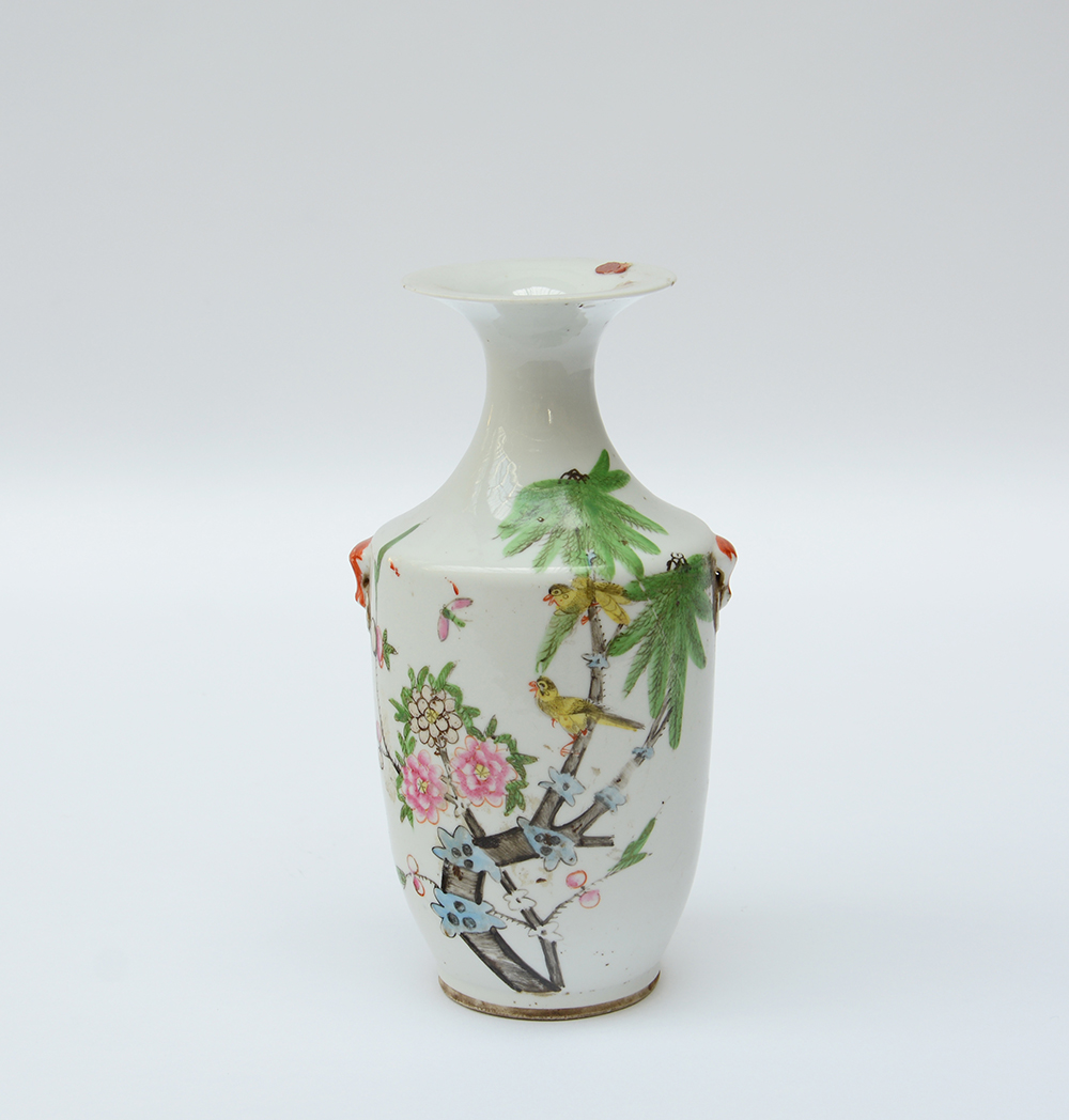 Vaso in porcellana policroma decorato con fiori e uccelli (lievi difetti) Cina, sec. XX (h. 26 cm.) -EN .