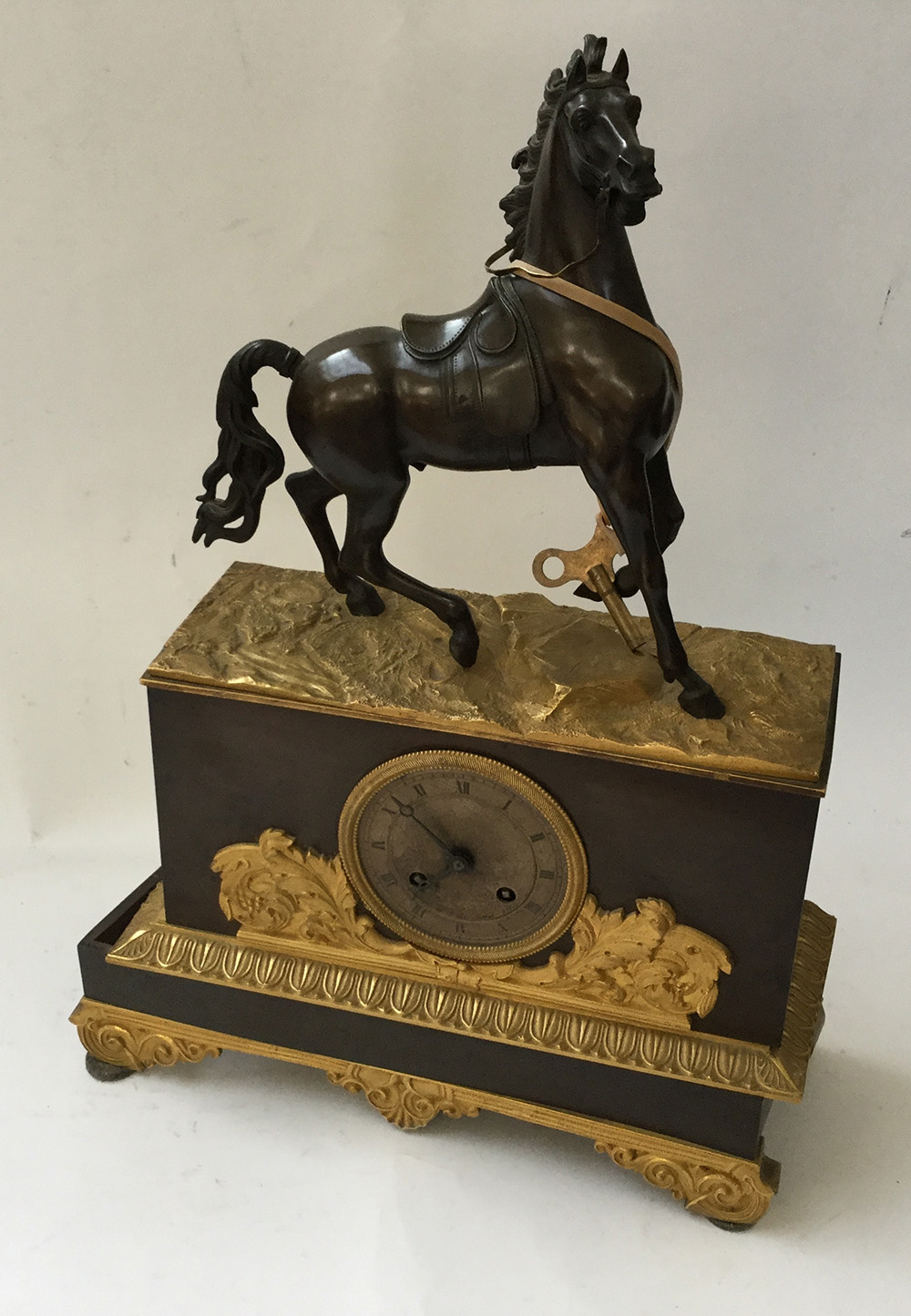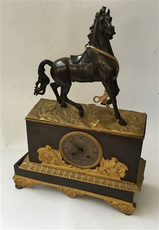 Pendola in bronzo dorato sormontato da cavallo, movimento con carica...