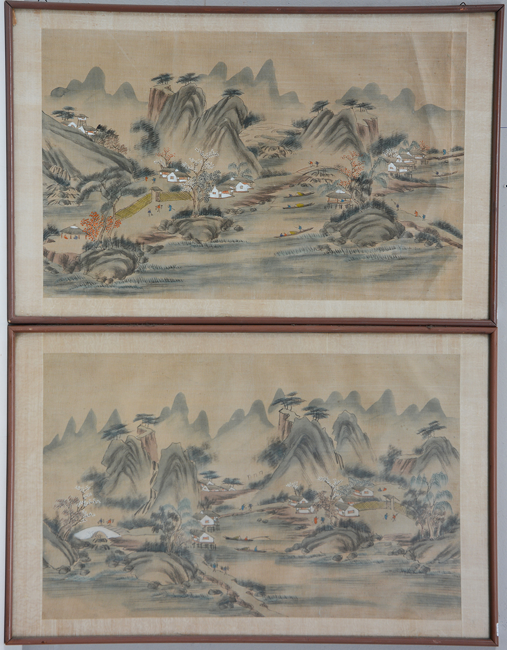 Coppia di dipinti ad inchiostro e colore su seta, montato su seta, raffigurante paesaggi con fiumi e monatgne, in cornice (difetti) Cina, sec. XX (34x54 cm.) -EN .