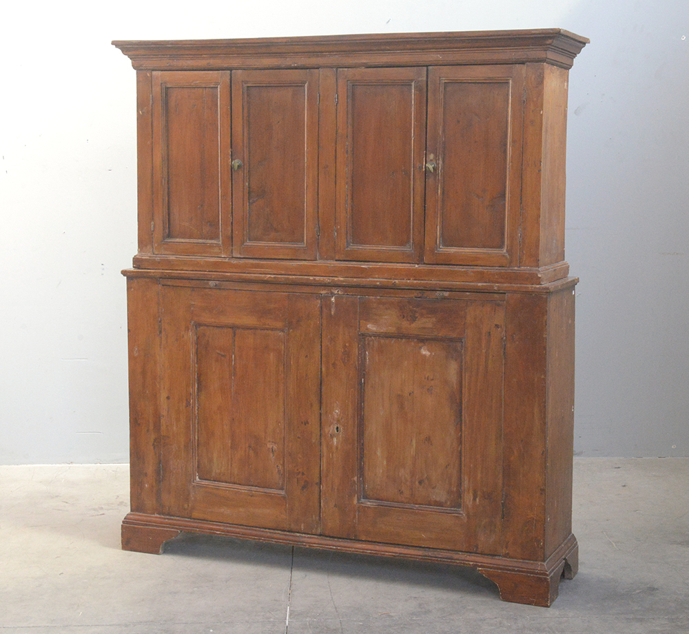 Antico mobile a due corpi in legno d'abete con sei ante riquadrate, due grandi nella parte inferiore, quattro più piccole nella parte superiore. Tiretto estraibile sotto il piano (cm 142x163x34) (difetti)