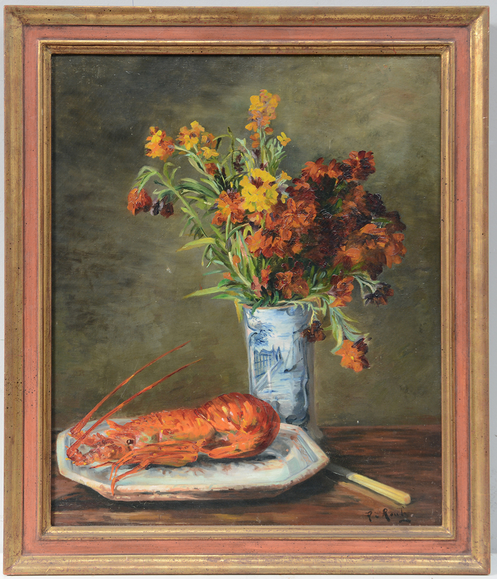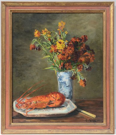 Scuola della fine del secolo XIX, "Vaso con fiori e aragosta" olio su tela (cm 66x55) reca Firma V. Rouby in basso a destra, in cornice (difetti)