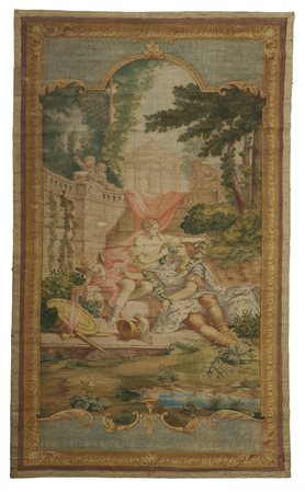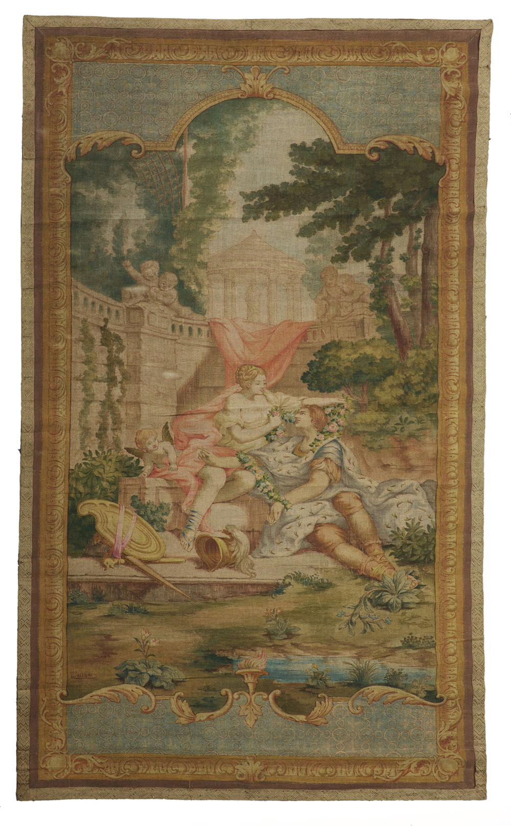 Arazzo, succo d'erba dipinto su tela con scena galante con putto, fontana,...