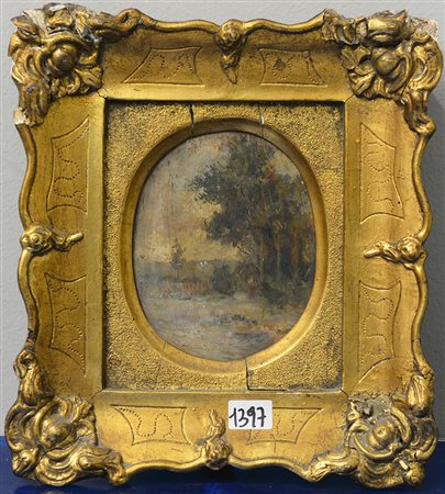 Firma indecifrata "Bosco" bozzetto ad olio (cm 15x11) Firmato in basso a sinistra. Al retro: cartiglio della Galleria d'Arte Pescetto. In cornice di legno e pastiglia dorata (difetti)
