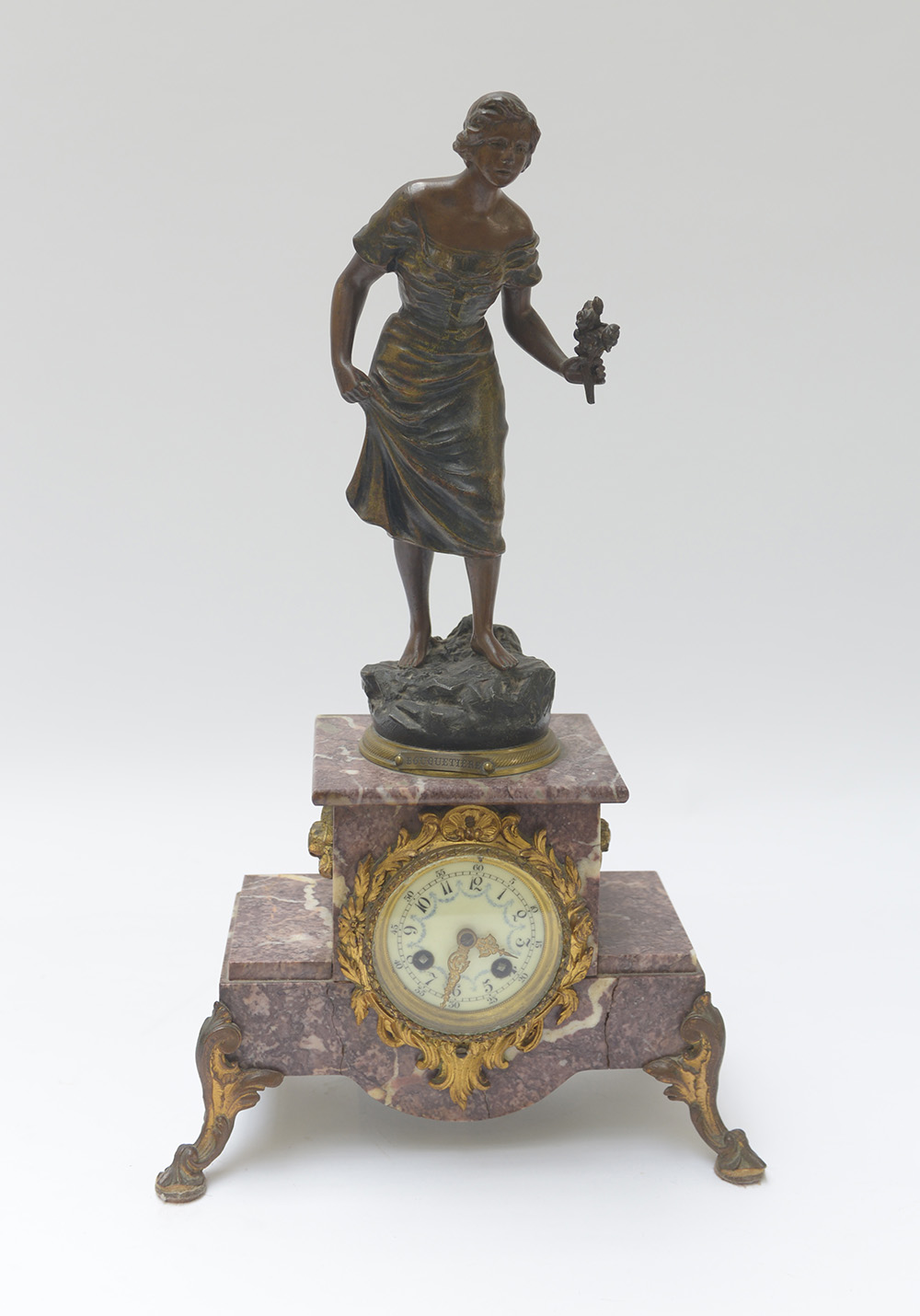 Pendola da tavolo francese in marmo rosa con guarnizioni in bronzo, sormontata da una scultura in metallo raffigurante una “bouquetière”, firmata alla base. Quadrante a numeri arabi con carica settimanale di ore e quarti (cm 29x51x15) (difetti)