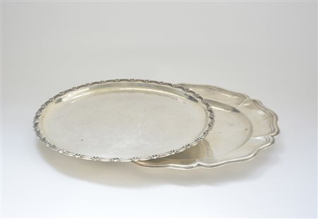 Lotto di due vassoi tondi in argento uno con bordo sagomato e cordonato, l'altro con bordo cesellato a fiorellini (gr 1600 ca.) (difetti)