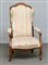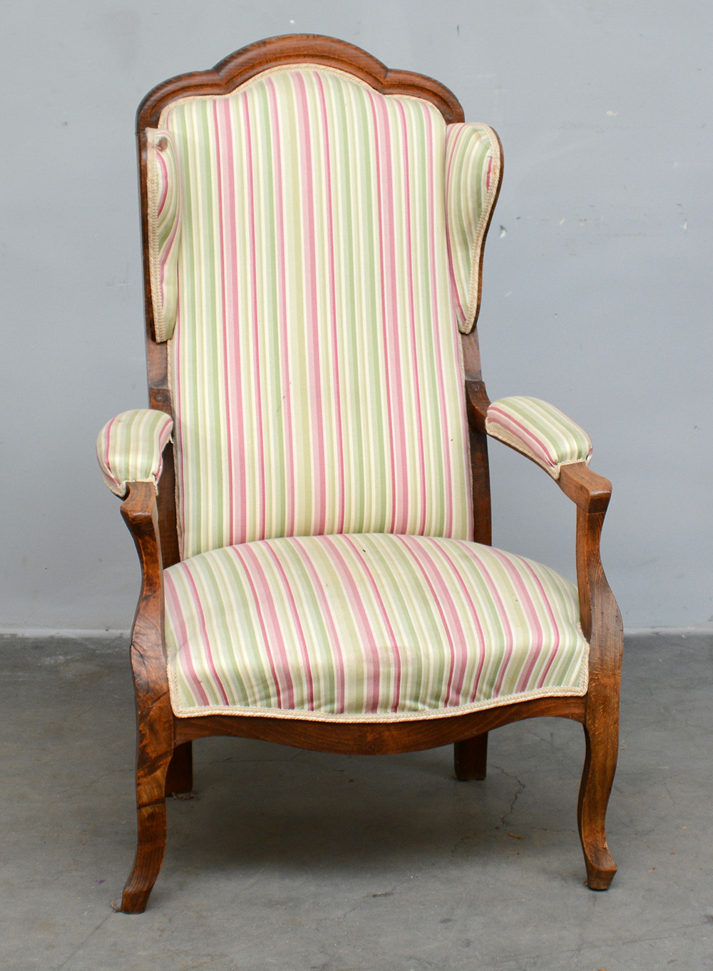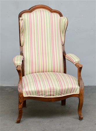 Poltrona a orecchioni con montanti e gambe sagomate rivestita in tessuto a righe (difetti)
