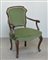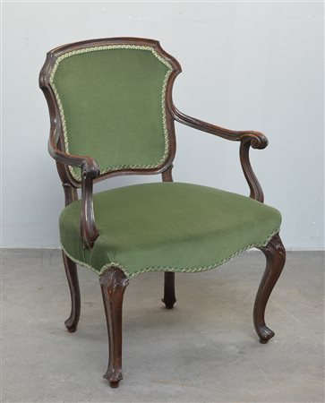 Poltrona in noce con schienale e braccioli intagliati e sagomati. Secolo...