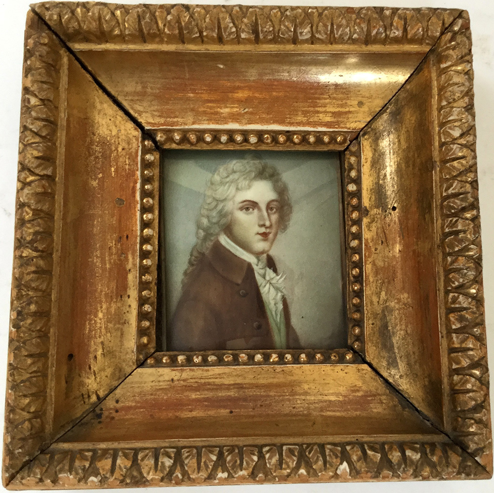 Miniatura su avorio (cm 7x6,5) raffigurante gentiluomo. Cornice del secolo XIX in legno intagliato dorato a palmette e perlinature (difetti)