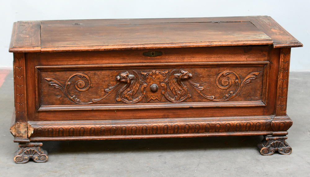 Piccola cassapanca con fronte e fianchi scolpiti ad animali fantastici e volute (cm 130x55x54) (difetti)