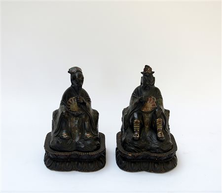 Coppia di dignitari con dettagli a smalti cloisonné e base in legno intagliato (difetti) Cina, sec. XX (h. 24 cm.)