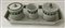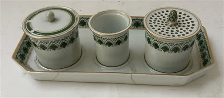Manifattura di Meissen. Servizio da scrivania in porcellana decorato a foglie verdi, composto da due vaschette, porta pennino e vassoietto (difetti e restauri)
