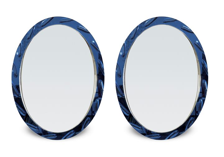 SPECCHI Coppia di specchi con cornici in vetro blu decorate al retro con...
