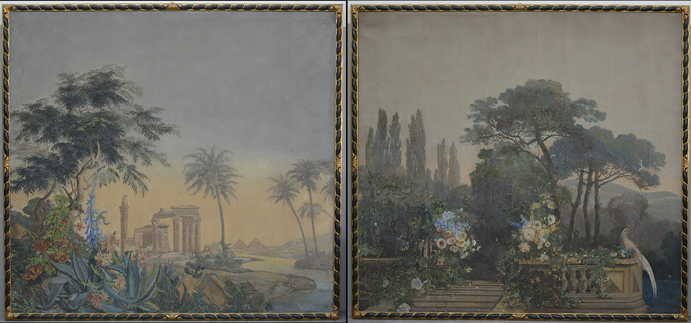 Coppia di papier peint del secolo XIX raffiguranti paesaggi con rovine classiche, piramidi, pavone e fiori (cm 210x223) In cornici laccate e dorate (difetti e restauri)