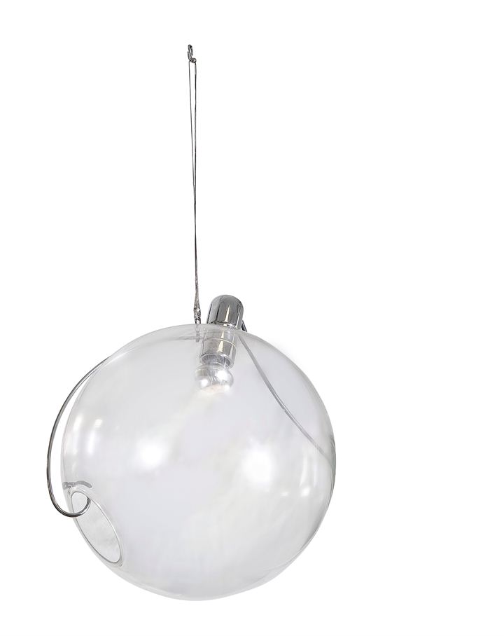 Lampadario in vetro soffiato iridescente con montatura in metallo cromato.