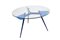 Tavolo rotondo con intelaiatura in metallo laccato blu, piano in cristallo temperato ed elementi decorativi di raccordo in cristallo blu.