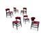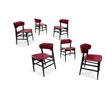 Sei sedie con struttura in legno ebanizzato, sedile e schienale avvolgenti imbottiti in gommapiuma e rivestiti in similpelle rossa.