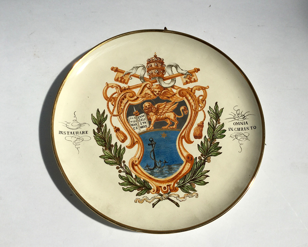 Piatto da parata dipinto con lo stemma pontificio di Pio X, iscrizioni al...
