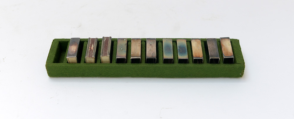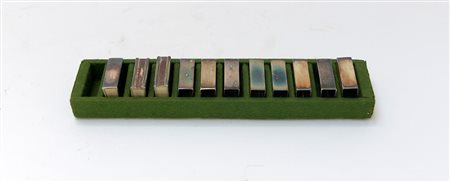 Gruppo di undici porta fiammiferi in metallo argentato a corpo liscio (difetti)