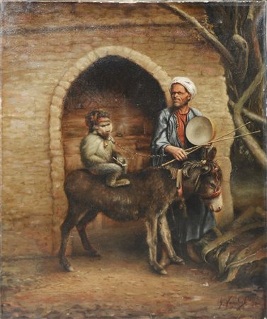 Firma indecifrata, "Suonatore di strada con asino e scimmia" olio su tela(cm 73x60) firmato e datato 1900 in basso a destra (difetti)