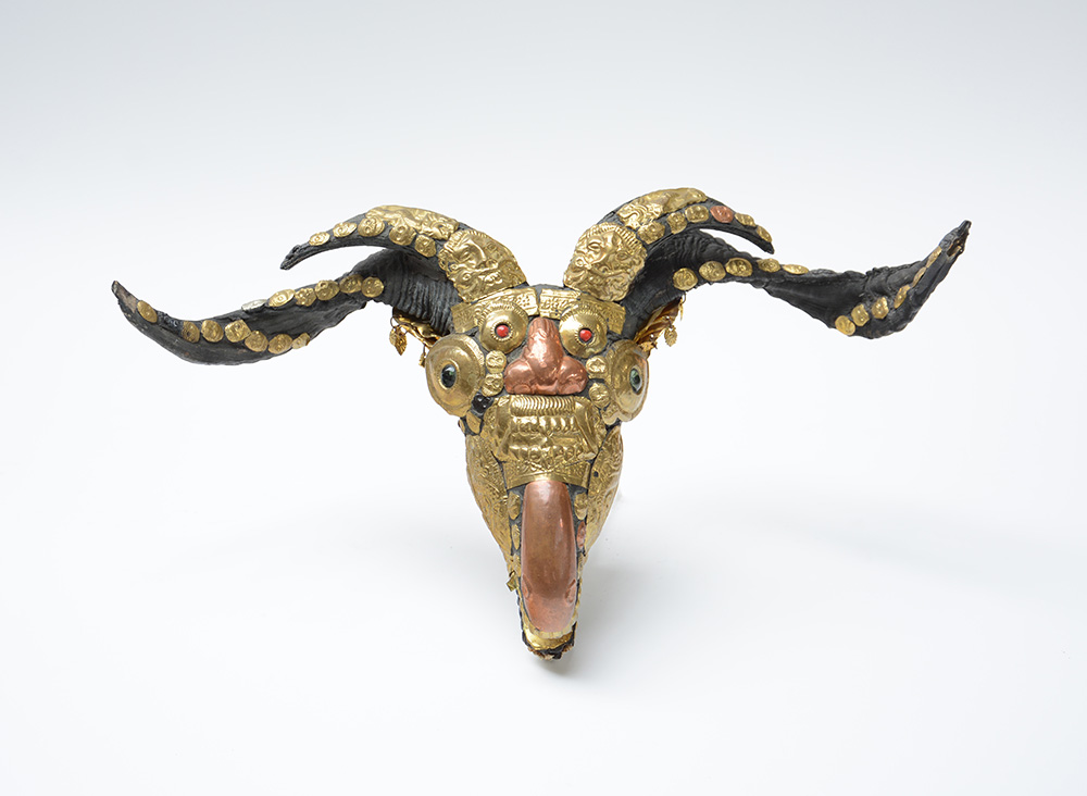 Arte africana, teschio di capra decorato con applicazioni metalliche (l cm 42) (difetti)