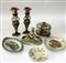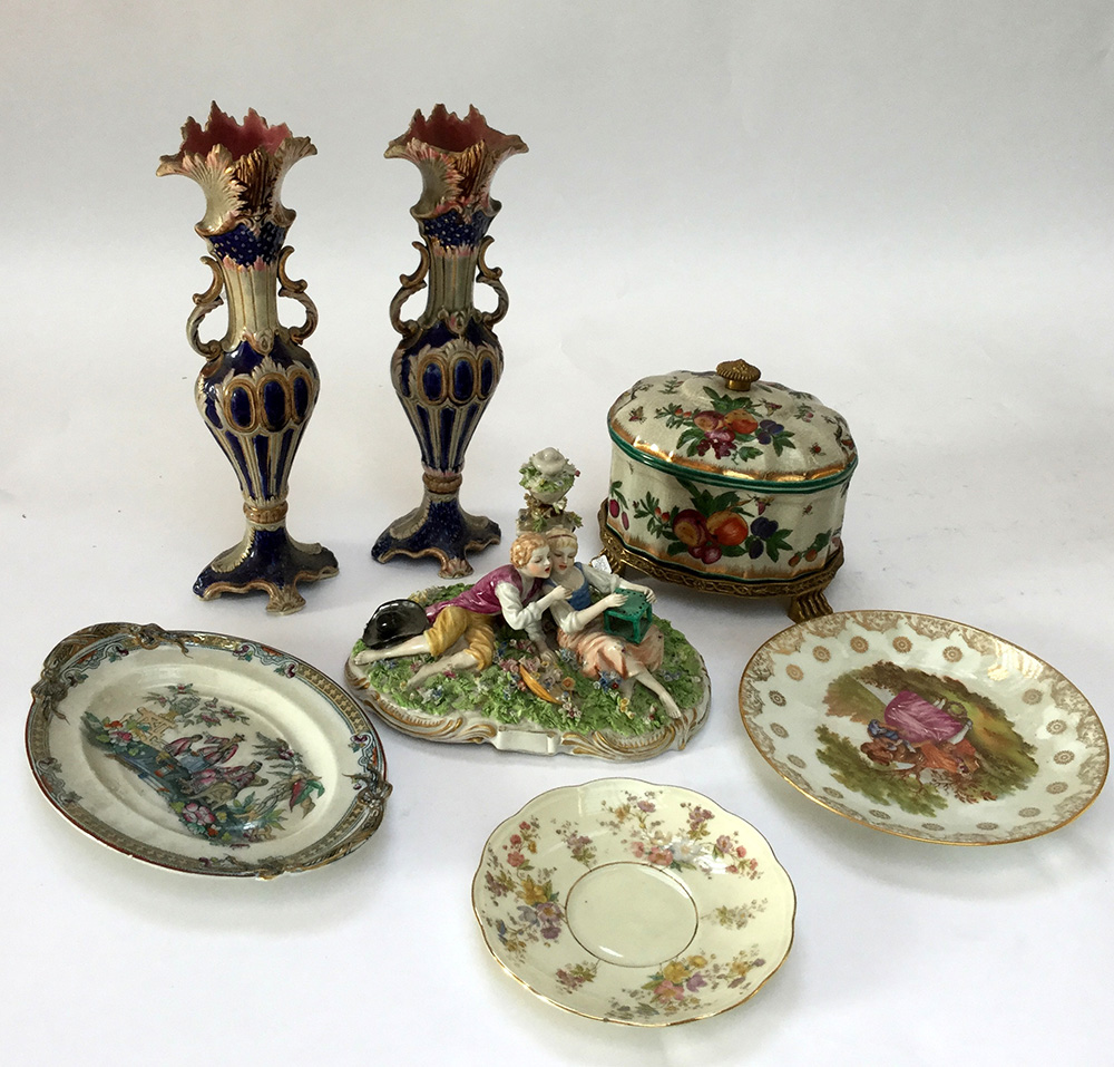 Lotto composto da una coppia di vasetti portafiori, una scatola con coperchio, un gruppo raffigurante fanciulli e tre piattini in ceramica e porcellana si epoche e decori diversi (difetti)