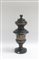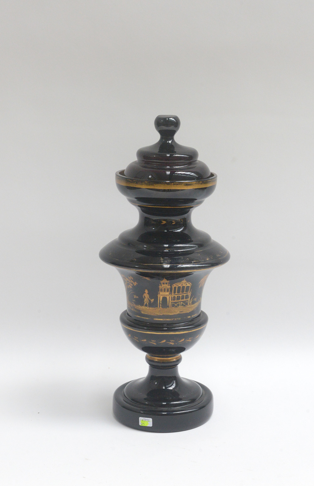 Vaso con coperchio in vetro nero con decori dorati a scene di genere (h cm 37) (difetti)