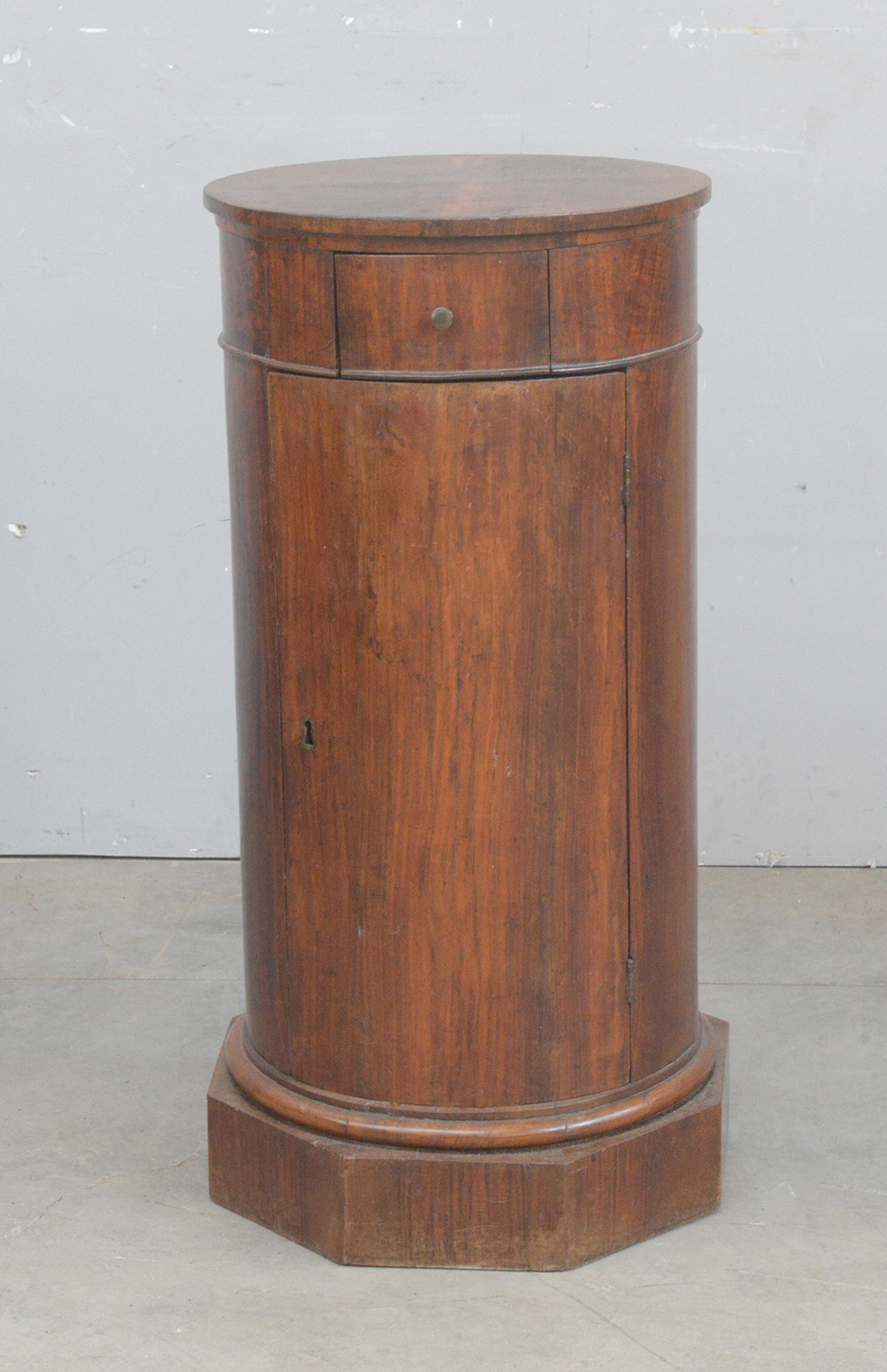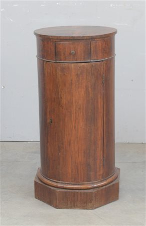 Comodino a colonna in noce con piano circolare, cassettino nella fascia e anta sul fronte e base ottagonale (cm 35x76x35) (lievi difetti)