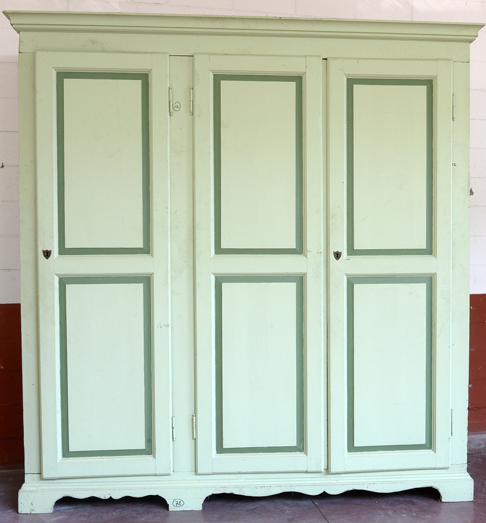 Grande armadio guardaroba in legno smaltato verde a tre battenti riquadrati,...